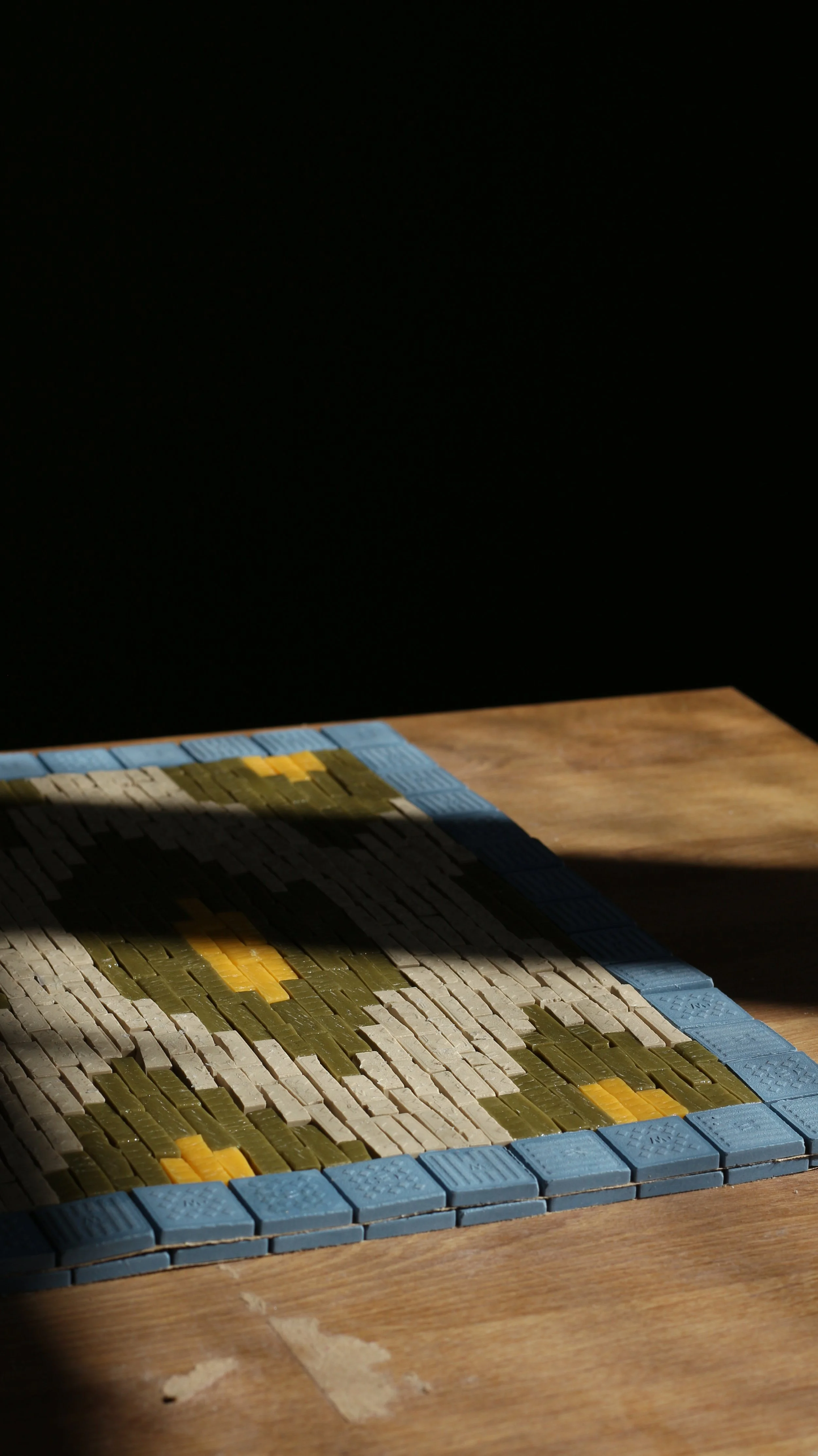 Ensemble de mosaïques en pierre de différentes couleurs, disposées en formes harmonieuses sur une surface en bois.