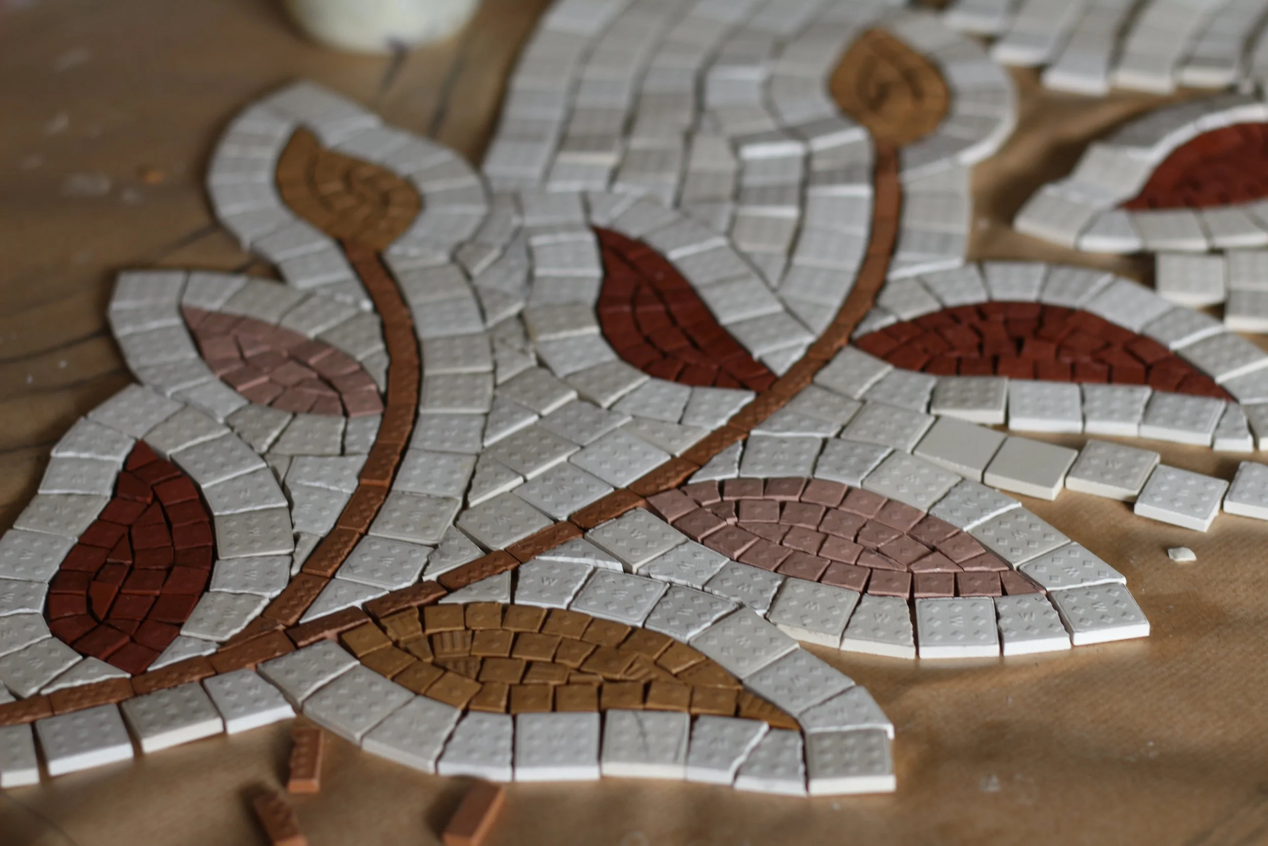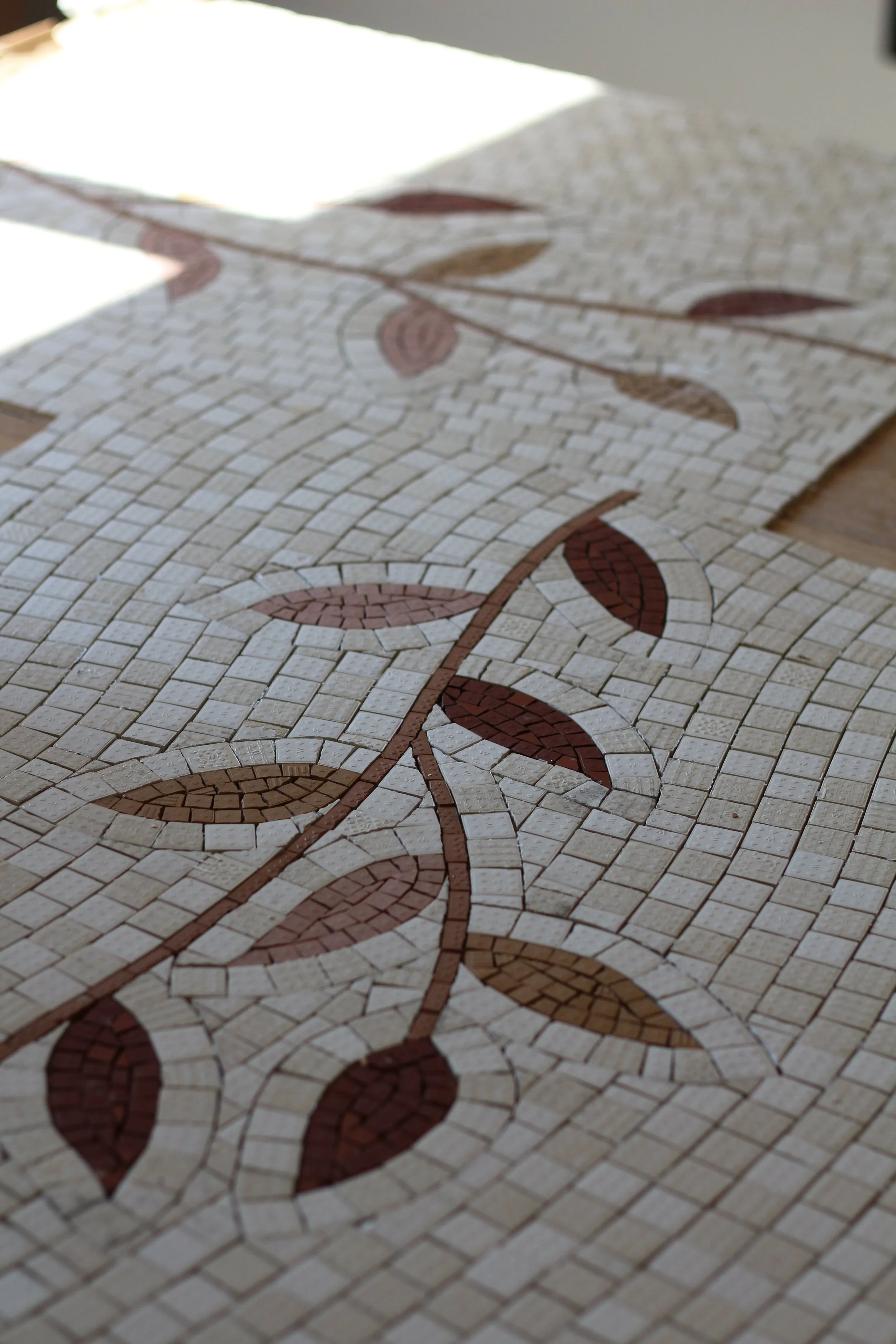 Une mosaïque en morceaux, avec un motif de feuilles rougeâtres, entourée de pièces de mosaïque gris clair, marron et blanc.