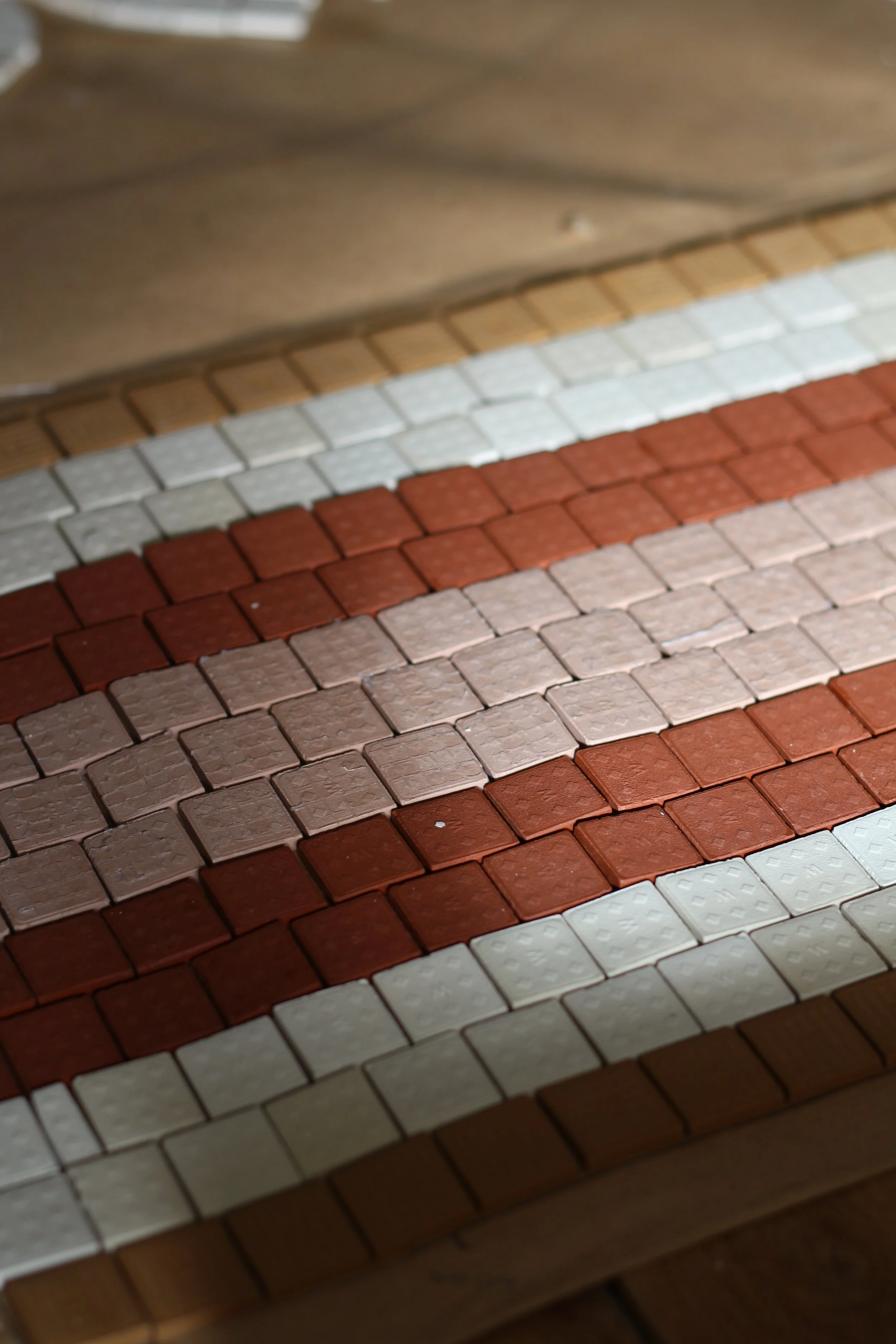 Dalles de mosaïque en différentes couleurs, blanches, rouges et beiges, disposées en bandes.